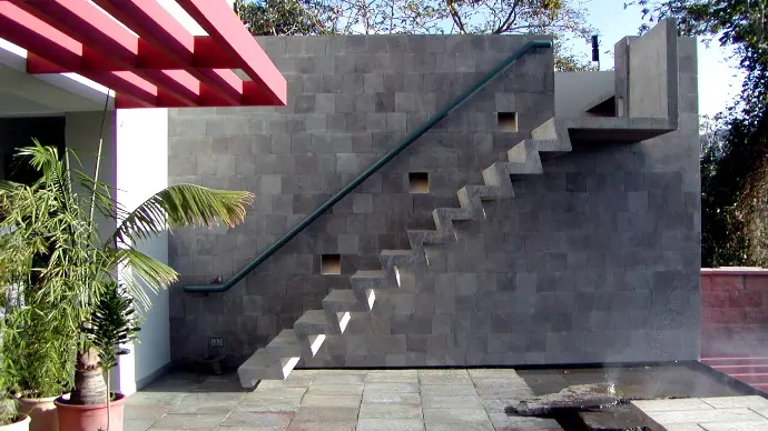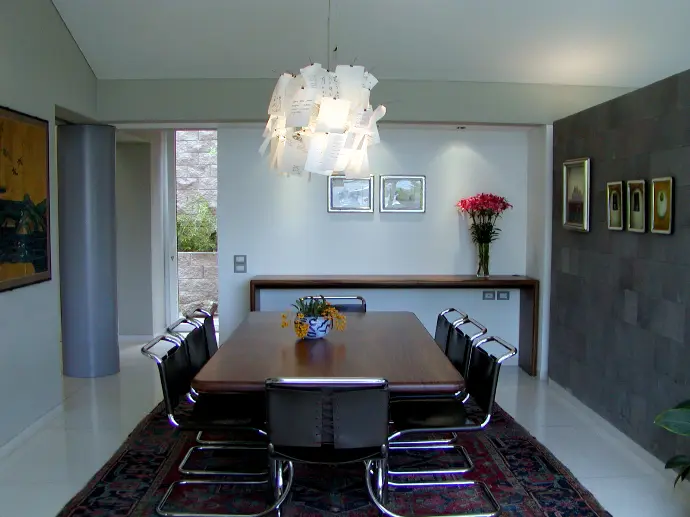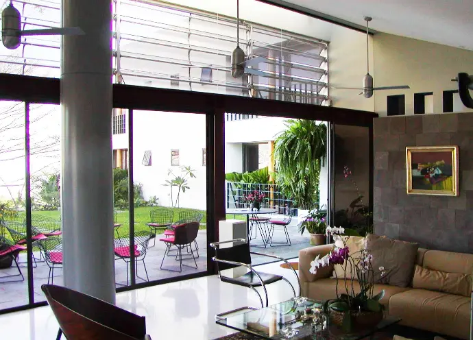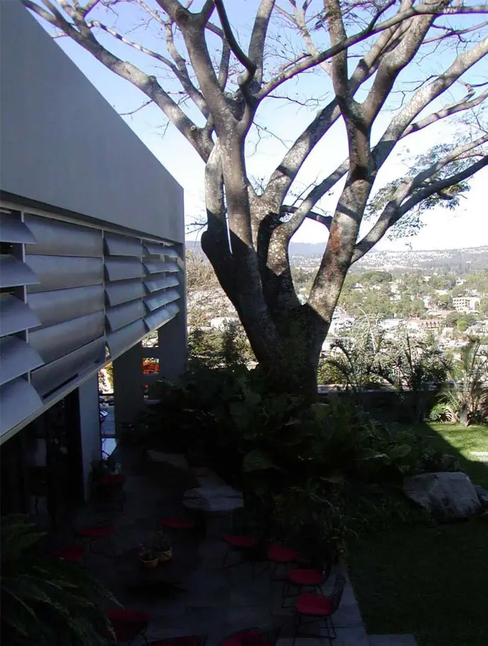 Esta residencia es conocida por las vistas panorámicas orientadas al valle y volcán de San Salvador. El diseño consiste en dos cuerpos rectangulares dispuestos de forma perpendicular que abrazan un enorme árbol de conacaste y una piscina circular. El primer cuerpo es de un nivel y contiene áreas sociales: sala, comedor y terraza y ofrece amplias aperturas hacia el norte. El segundo es de dos niveles y alberga el resto de las áreas. El agua potable se calienta con paneles solares.