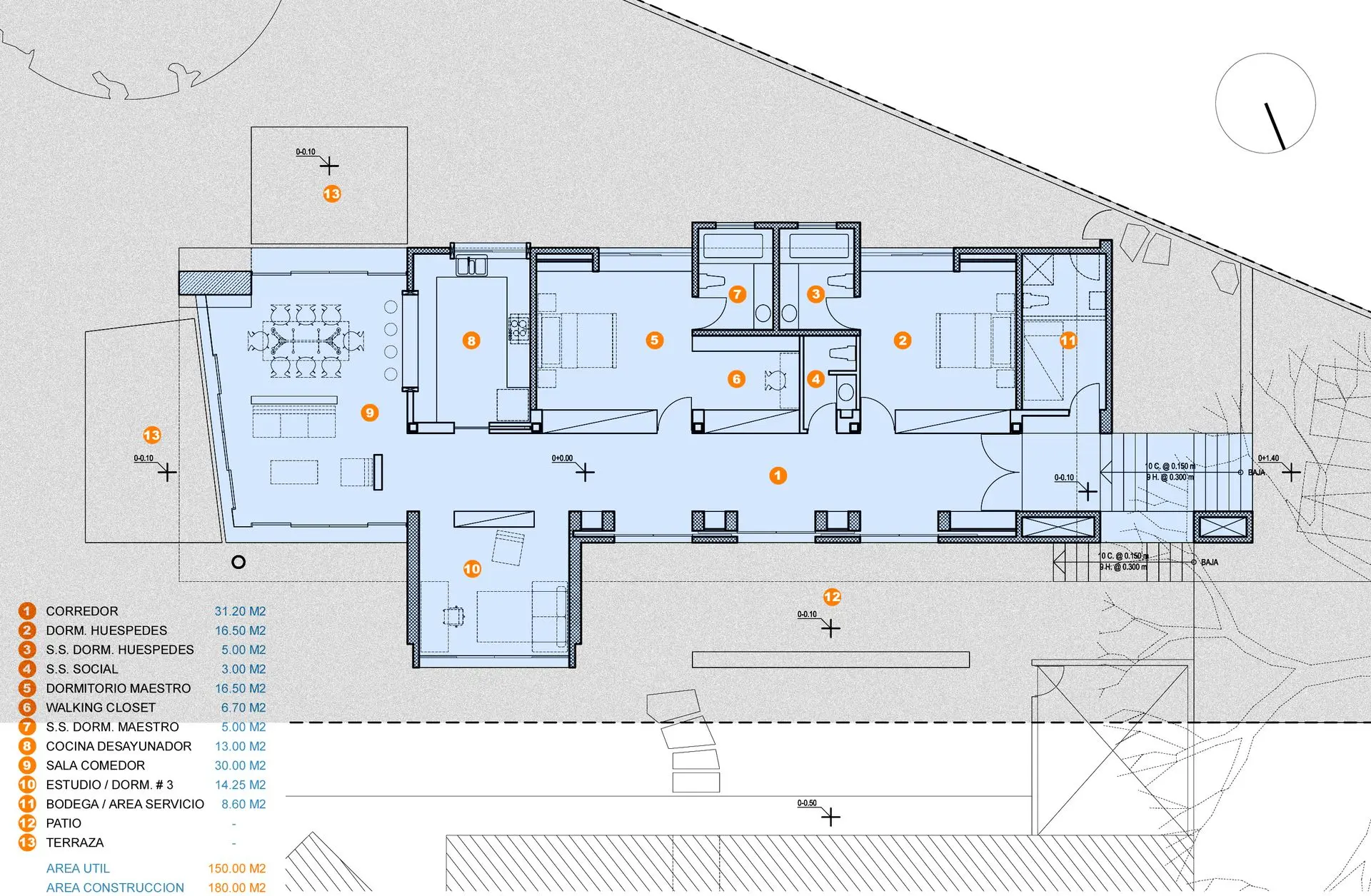Proyecto de diseño arquitectónico y desarrollo de planos constructivos para una residencia unifamiliar ubicada en los Planes de Renderos. La propuesta organiza el programa arquitectónico en torno a un eje principal que articula de manera eficiente las áreas sociales, privadas y de servicio, promoviendo una distribución funcional, la fluidez espacial y una fuerte conexión con el entorno natural.
